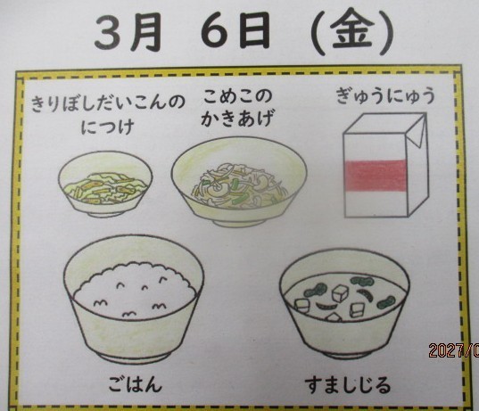 今日の献立は、「ごはん・すましじる・米粉のかきあげ・切り干し大根の煮つけ・牛乳」でした。