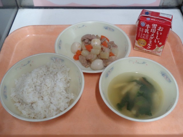 今日の給食は、「麦ごはん、プリプリ中華炒め、油あげと青菜のスープ、牛乳」でした。大人気メニューの“プリプリ中華炒め”は、中華風の味付けのあんが絡んだこんにゃくやうずら卵の食感がとてもよかったです。温かいスープと一緒に美味しくいただきました。ごちそうさまでした。