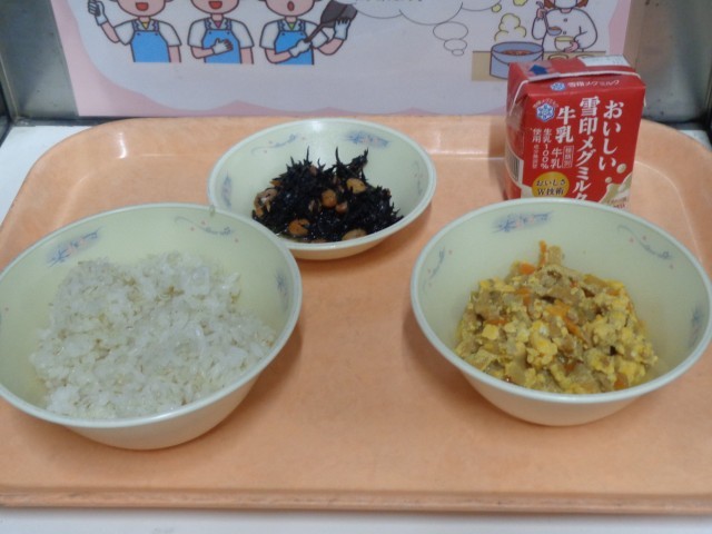 今日の給食は「麦ごはん、あげたま煮、ひじき豆、牛乳」でした。油あげにしみた味が噛むたびにジュワっと口の中に広がって、幸せな気持ちになりました。ひじき豆もごはんとよく合って美味しかったです。ごちそうさまでした。