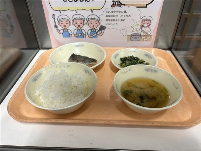 今日の給食は、「ごはん・牛乳・さわらの塩こうじあげ・だいこん葉とじゃこのいためもの・みつばのみそ汁」でした。