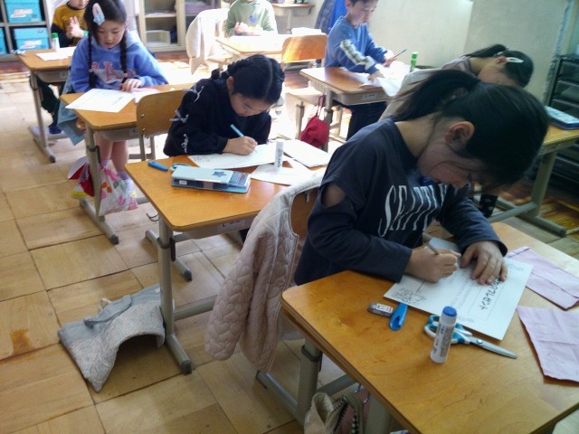 次の1年生にプレゼントする手紙と種の準備をしました。アサガオの花の色水で染めた和紙を使って封筒を作り、お手紙を入れたり、花の種を入れたりしました。2年生になったら、1年生に届けます。