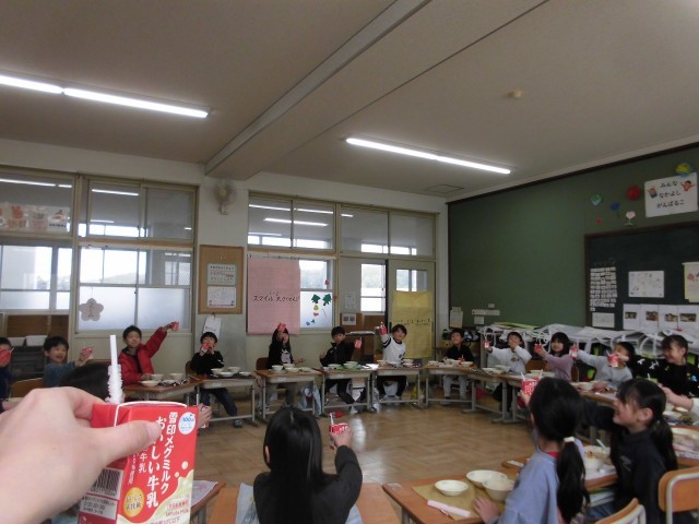 最後の給食の時間は、みんなで輪になってたべました。みんなの顔を見ながら食べる給食はとても美味しかったです。最後に良い思い出ができました。