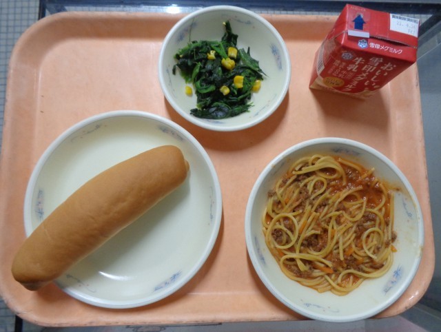 今日の献立は、「牛乳・スパゲティのミートソースに・ほうれん草のソテー・こがたコッペパン」でした。1年生の入学をお祝いする献立です。