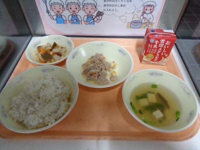 今日の給食は「麦ごはん・牛乳・すまし汁・豚肉の生姜炒め・五目煮豆」でした。