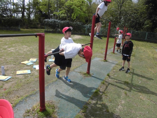 体育では、「てつぼうあそび」をしています。