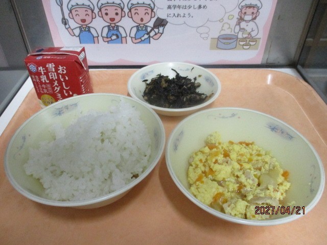 今日の給食は「ご飯・牛乳・親子煮・ひじきの煮つけ」でした。