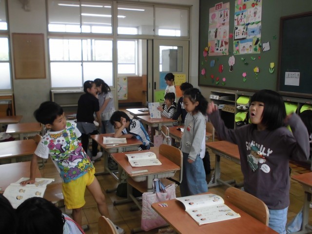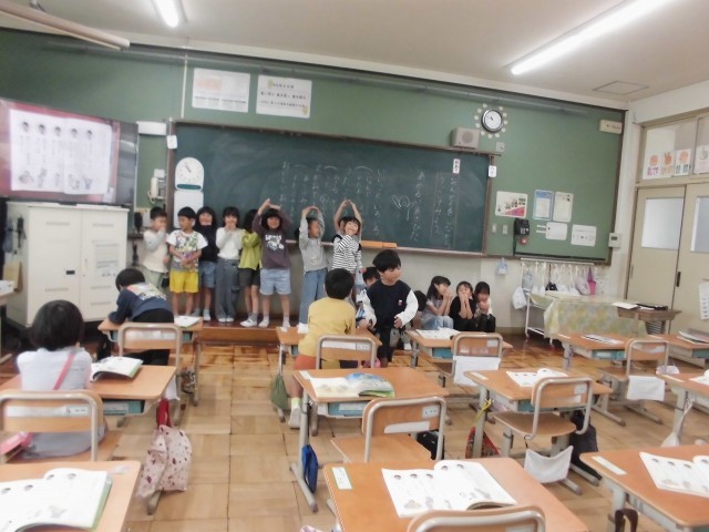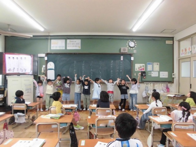 国語の時間に、音読の内容に合わせて体を動かしてみました。「“あかるいあさひだ”はどんな動きかな?」と一人で考えてみて、最後にはみんなで交流をしました。たくさんのいい動きがあり、にこにこ笑顔で音読をすることができました。