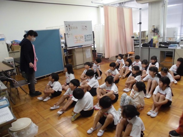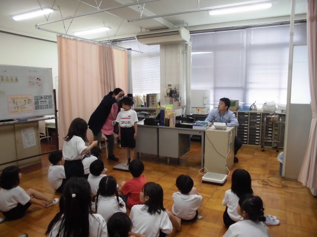 1年生が身体計測と視力検査を行いました。検査の前には、養護教諭から保健室でのきまりや健康診断の大切さについての話を聞きました。子どもたちは集中して話を聞き、正しい受け方を学んでいました。
