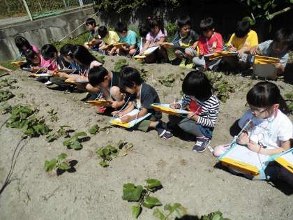 サツマイモの苗を植えて2週間が経ち,苗の成長をみんなで観察しに行きました。