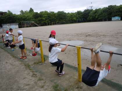 体育科での「てつぼうあそび」が始まりました。雨が降った後でしたが,天気が少し良くなってきたので,準備運動をしっかりした後,みんなで鉄棒での活動を頑張りました。自分が今できる技を一生懸命がんばっていました。これからも頑張ってくださいね。