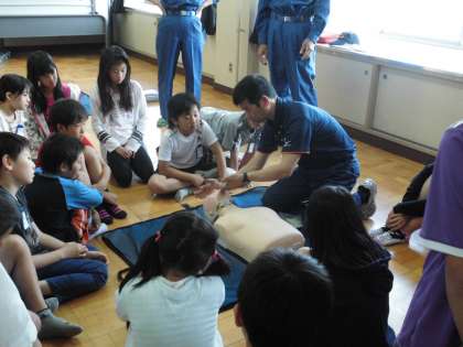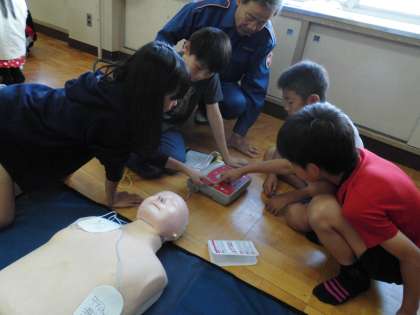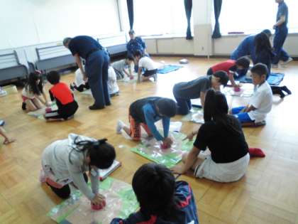 今日は西京消防署と福西消防分団の方々にお世話になり救急救命講習会が行われました。
