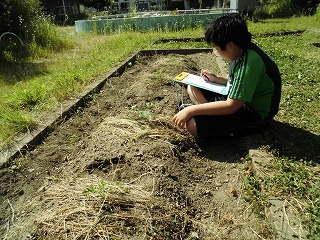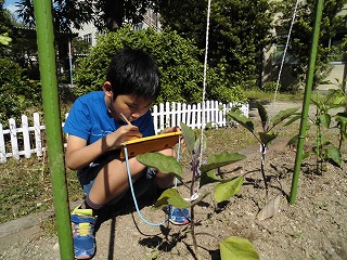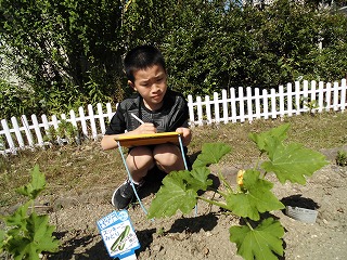 今年は少し遅めに植えた野菜たちですが…。少しずつ花を咲かせたり,茎が伸びたりと成長しています。観察カードをかきました。よく見ると,「先生,花が咲いている。花のつぼみがあるよ」など気づくことができました。今,つくしではさつまいもやミニトマト,ズッキーニ—,なすび,ピーマン,オクラ,スイカなどいろいろな野菜に挑戦しています。水やりも頑張っています。