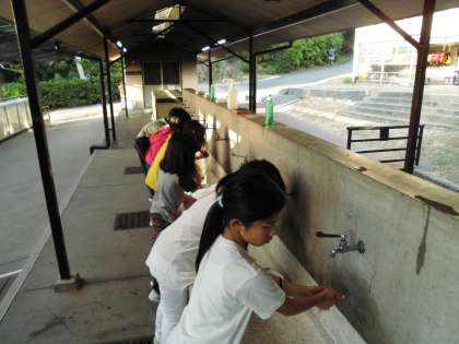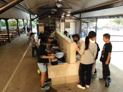 カレーライスを美味しくいただいた後は、後片付けです。飯ごうにくっついたご飯を洗うのが、なかなか大変でした。先生に合格をもらうまで、何回でもやり直しです。