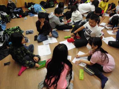 まずは、班ごとに集まって、今日一日の様子をふり返りました。その後、全体で交流です。
