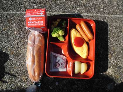 コッペパン、牛乳、オムレツ、ウインナー、…です。学校の給食では、この頃出なくなったイチゴジャムがついていました。
