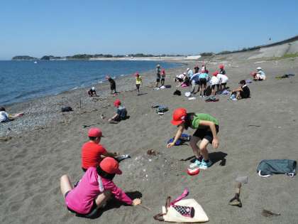 到着すると、そこには太平洋がどーんと広がっています。砂浜の砂や小石、流木などを使って造形遊びをしました。出来上がった班は写真屋さんを呼んで、