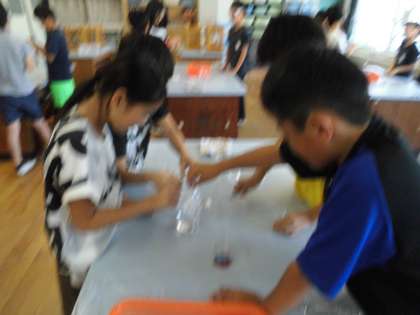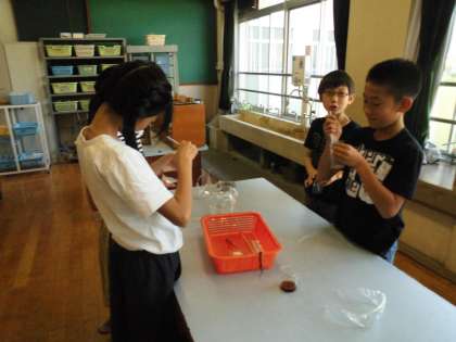今日は「ご飯は口の中でだ液と結びつくとどうなるのだろう」ということで実験をしました。実験は人の口の中を再現するような内容で行いました。結果では少し戸惑う様子もありましたが,改めて自分たちの予想と比べることで結果のエラーにも気づくことができました。