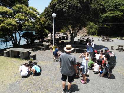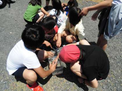 昼食の後、所内の大型水槽で飼ってあるクラゲの観察をしました。直接、手で触れることもできました。
