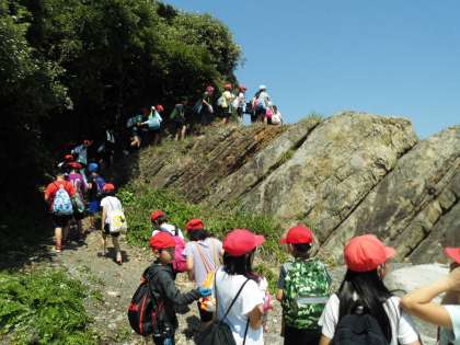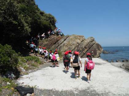 午後からのメインの活動は、宮崎浜での磯観察です。みさきの家から歩いて宮崎浜へ向かいます。途中、かなりの難所もあり、転ばないように細心の注意を払います。