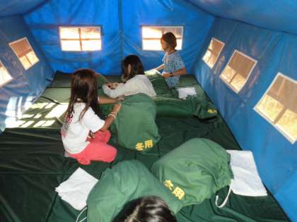 一人ずつ、シェラフ(寝袋)を受け取って、テントサイトへ。グループのみんなと協力して準備をしました。