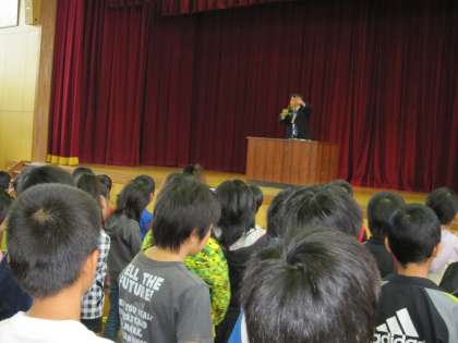 終業式の中で,子どもたちに「前期の間にいろいろな行事を通して成長しましたね。」と学校長が話し始めました。続いて,「チリでの落盤事故のことから,食料を分け合い,助け合って地下で生き延びられた人々や地上で救出しようと夜も寝ずに活動された人々の力のすばらしさや仲間の事を考えて行動するすばらしさ」を話し,「自分達のこれまでを振り返り,後期はどんなことをがんばるのかを考えよう」を呼びかけて話を終わりました。