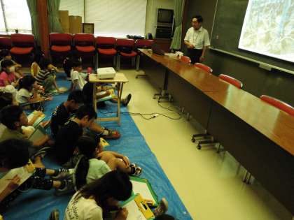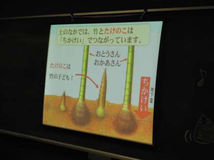 まずは,渡辺先生から竹について教えていただきました。竹の成長の仕方や地下茎の様子・竹の皮についてなど丁寧に教えてくださいました。福西の校区にもある身近な竹ですが,知らないことばかりで子どもたちからも驚きの声があがりました。