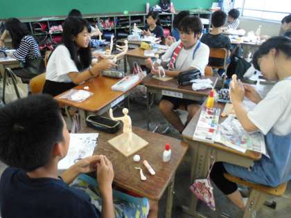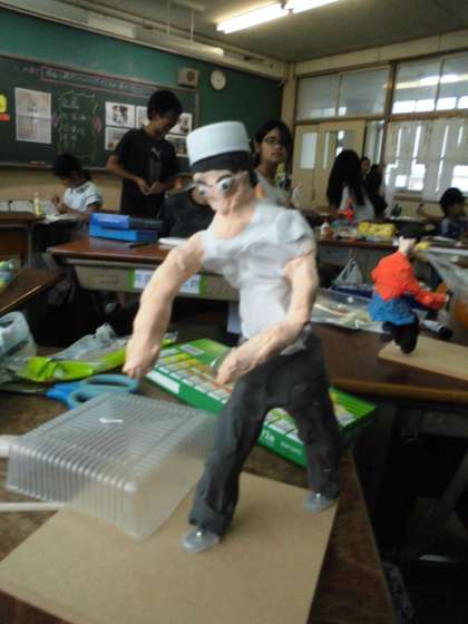 図工「12年後のわたし」では針金を使い体の芯をつくり,夢の職業を思い描いて粘土で肉付けをしています。