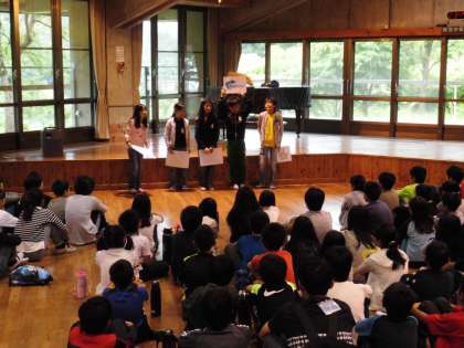 今回、一緒に宿泊している三校が合同で朝のつどいを行いました。桃山小学校、福西小学校、岩倉北小学校の順に学校紹介をしました。