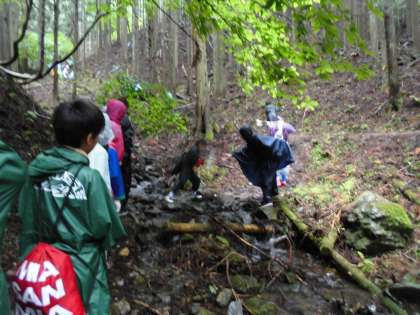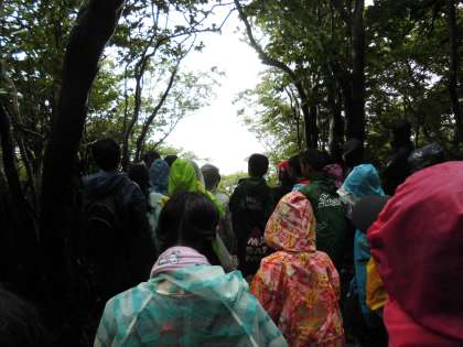 途中、なかなかの難所を切り抜け、何回か休憩をはさみながら、頂上に到着しました。頂上から、花背山の家に向かってみんなの声を合わせて、