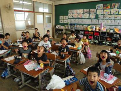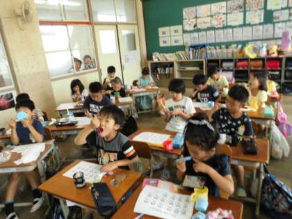 どのように虫歯になるのかを学習した後,虫歯にならない正しい歯のみがき方を学習しました。普段から自分では歯をきれいにみがいているつもりでも,いざカラーテスターで自分の歯を染めてみると・・・。子ども達からは、「あっ。歯が真っ赤になった!」という声が多くあがっていました。これから自分の歯でみがき残しがないように,頑張りましょう。