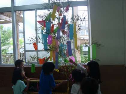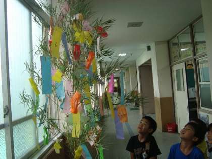 短冊に願い事を書いて,笹に飾り付けをしました。