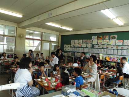 また,2年生の配膳の様子を視察された後,いただきますをして,「さけのしおこうじ焼き」「こうやどうふのそぼろに」麦ごはん,牛乳を子ども達と一緒に食べられました。 2年生もたくさんの先生方に囲まれ,色々なお話をしながら楽しそうに給食を食べていました。