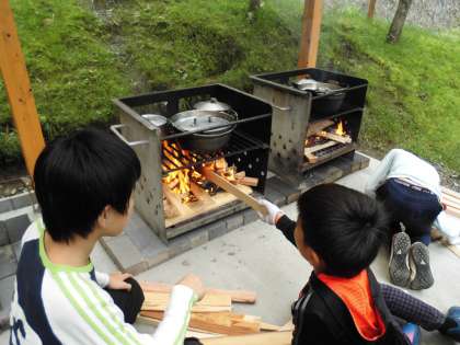 野外炊事も二度目ともなると、ずいぶんとスムーズに進みます。かまどの薪も上手に組み、一発で火をつけることができました。