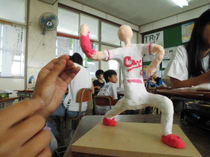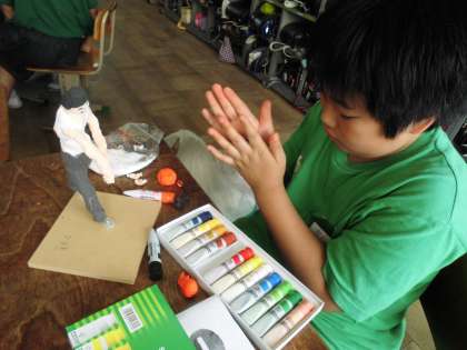 粘土ですべてを完成させるのではなく,どの部分をどのような材料を使って、いかに表現豊かにするかがポイントです。腕の部分にストローを通して関節をつくる人,木の板を削って組み合わせ机をつくる人,つまようじを使って万年筆をつくる人などみんなよく考えています。