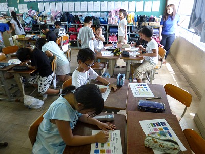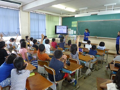 企業から講師の方に来ていただいて,「いきものの「すごい」と「ふしぎ」センサーの力」というテーマで環境学習を行いました。放射温度計を使ってモノに触らずに温度を測ったり,紫外線が出るペンを使って人間の目には見えない記号を見たりしました。