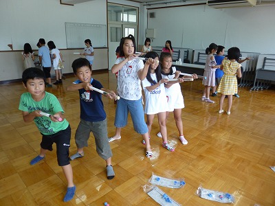 理科の「とじこめた空気や水」の学習で,空気でっぽうをしました。筒の中の様子を絵にかいて考えた後,紙コップを的にしてみんなで楽しみました。