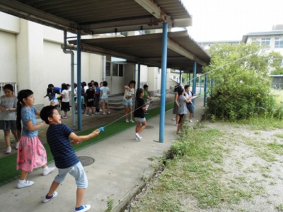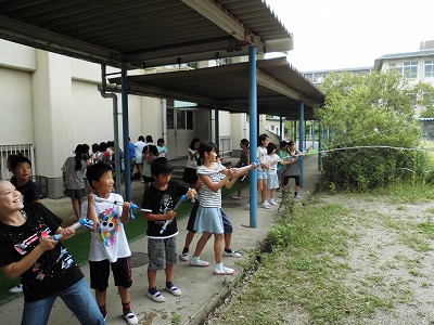 理科の「とじこめた空気や水」の学習で,水鉄砲をしました。水を遠くまで飛ばすために,筒の先の大きさや水と空気の量,おし方などを工夫して楽しみました。