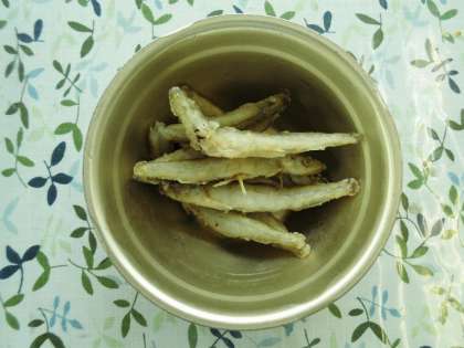「わかさぎのガーリックあげ」は,新献立です。わかさぎに,にんにく(ガーリック),料理酒・塩・こしょうで下味をつけて,ころもをまぶして油であげてあります。