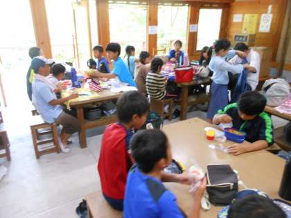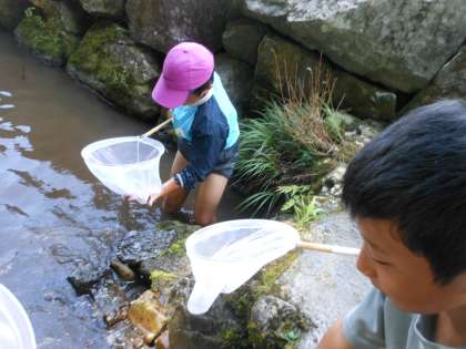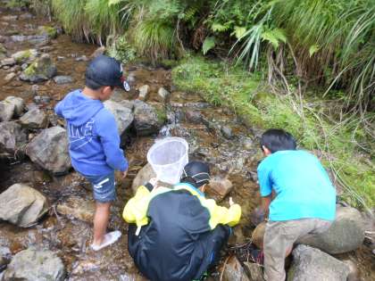 子どもたちは午前中で川に慣れ,網を使って協力してカニや魚を捕まえていました。大きな魚が網に入ると歓声を上げながら楽しんでいました。