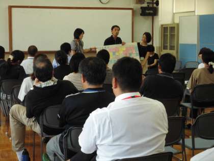 西陵中学校,竹の里小学校,福西小学校の教職員が福西小学校に集まって「小中合同夏季研修会」を行いました。西陵中学校ブロックの子どもたちの学力の向上をめざして,授業改善や生徒指導の手法,人権教育などについて話し合いました。