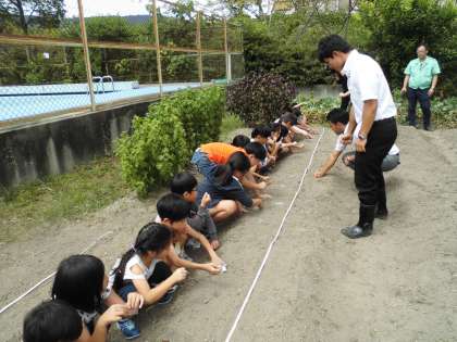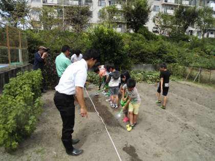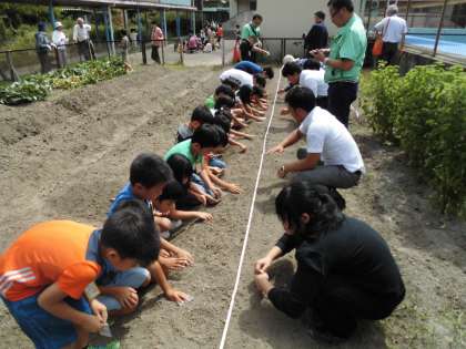 そして,地域の方々のご協力も得て,畑で大根の種をまきました。始めに思っていたよりも大根の種は小さく,子ども達からは「こんなにちいさかったの?」と驚きの声が多く挙がっていました。