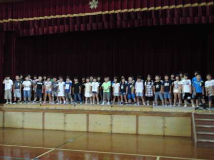 「敬老の集い」に向けて,2年生全体での発表練習を頑張っています。教室での練習と違い,体育館で練習するととても緊張していましたが,大きな声で練習しました。お家でも是非応援してあげてください。