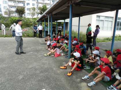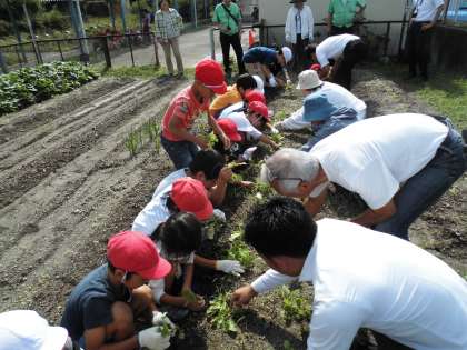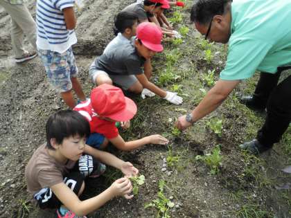 この前植えた大根もずいぶんと大きくなってきました。今日は,JA徳島・京果・タキイ種苗・地域の皆様のご協力をいただきまして,大根の間引きをしました。始めに大根の間引きの仕方を学習した後,大根の間引きをしました。