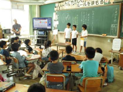 社会見学グループは京都駅に社会見学に行ったことをふりかえり,社会見学は教科書の写真で見るより実際に行ってみる方が迫力があったことや習字グループは各道具の名前や使い方,それぞれが楽しいと感じていること,気をつけていることなどを伝えてくれました。