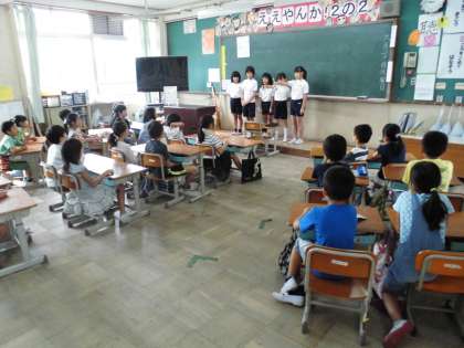 国語「つたえよう,楽しい学校生活」の発表が始まりました。今日は「社会見学」と 「習字」グループの発表でした。