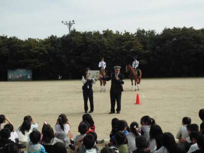 1・2年安全指導で,西京警察署と平安騎馬隊による交通安全指導がありました。道路の安全な歩き方や危険の避け方を学習した後,平安騎馬隊による実演がありました。号令とともに俊敏に動く馬の姿に,子どもたちは見入っていました。最後は,平安騎馬隊の馬に見送られながら下校しました。