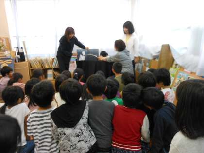 今日は「お話宝石箱」が中間休みにありました。低学年は特に楽しみにしていたのか,休み時間になるとすぐに集まってきました。参加するともらえる素敵なシールも楽しみの一つのようです。