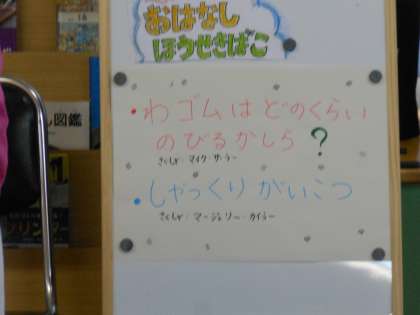 さて,今日は「わゴムはどのくらいのびるかしら?」と「しゃっくりがいこつ」の2つの楽しいお話の読み聞かせでした。ページをめくるたび,驚きと喜びの歓声があがっていました。不思議で楽しいお話の世界をみんなで味わえた素敵な休み時間でした。