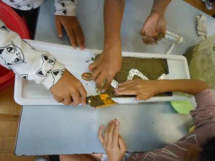 5年生は理科で流れる水の3つの働き「削る」「流す」「積もらせる」について学習しています。今日は川を模した実験装置を用意し,川のどこで,どのような水の働きがみられるかを予想し観察しました。それぞれの働きが目の前でよくわかり,「すごい」「予想通り」など楽しみながら学習している様子でした。