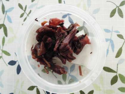しば漬けは,京都の「三大つけ物」の一つで,左京区の大原で昔から作られています。なすと赤じそを塩でつけて作られます。ごはんと一緒に食べるとおいしいです。